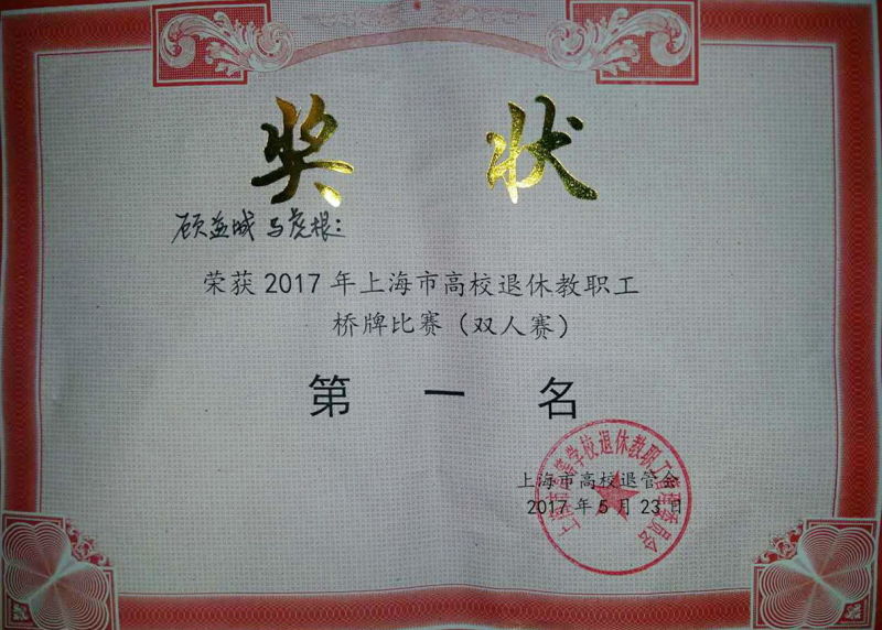 2017年5月23日上海市高校退休教职工桥牌双人赛在复旦大学上海医学院举行,来自本市二十几所高校的72位(36对)选手参加了角逐。比赛分成AB两个组,每组18对选手打18副牌。历经3个多小时的紧张比赛,我校退休教师顾益城和马虎根一对选手获得了B组东西方第一名。