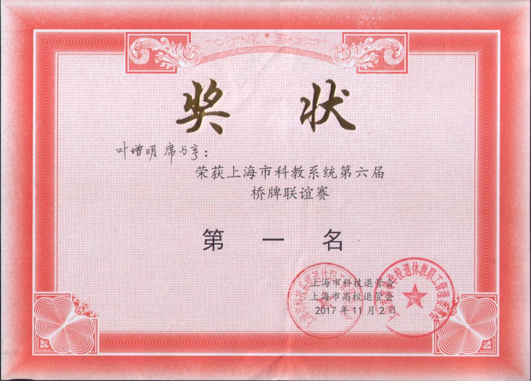 2017年11月2日,上海市科技系统退管会和上海市高校退管会联合举办“上海市科教系统第六届桥牌联谊赛”,由市科技系统和高校各推选10对代表选手参加比赛。比赛分A、B两组,每组各比赛20副牌。我校席与亨和叶增明两位退休教师作为高校的一对选手参加了B组的比赛。经过3个多小时的紧张搏斗,我校席与亨老师和叶增明老师这一对选手获得了B组南北第一名。